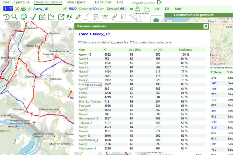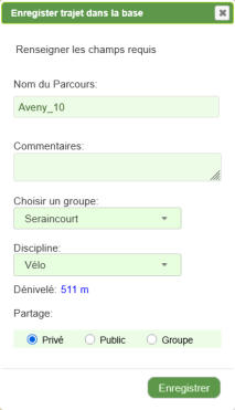 En ayant cliqué sur «Mes Parcours», comme précedemment et en sélectionnant un nom de parcours dans la liste,